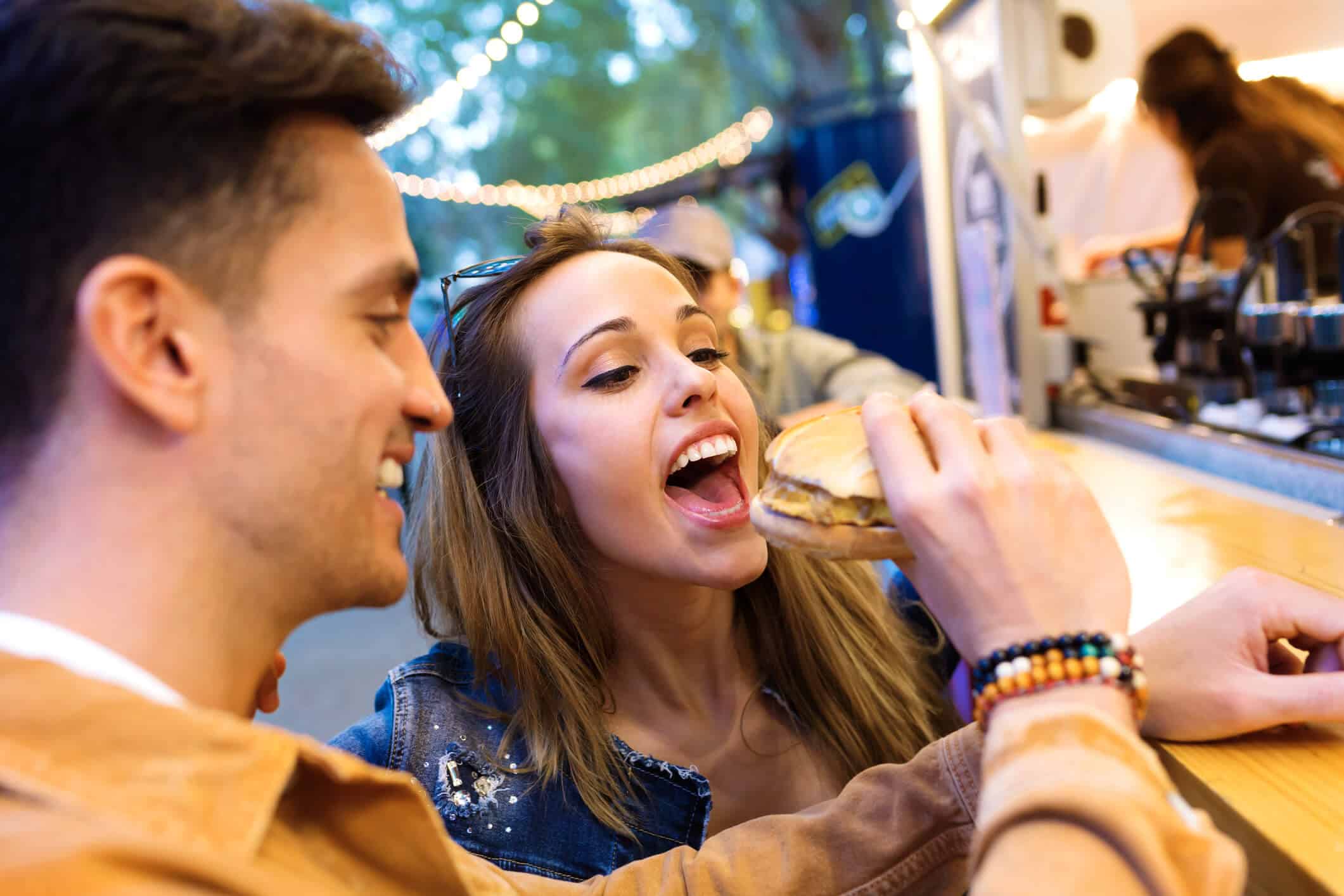 Homem e mulher se divertindo em um festival de comida de BH. O homem está servindo um hambúrguer para a mulher